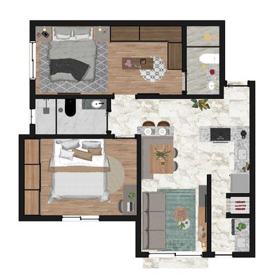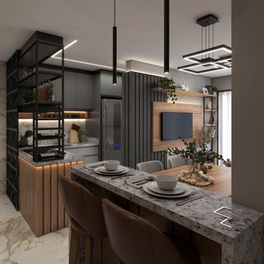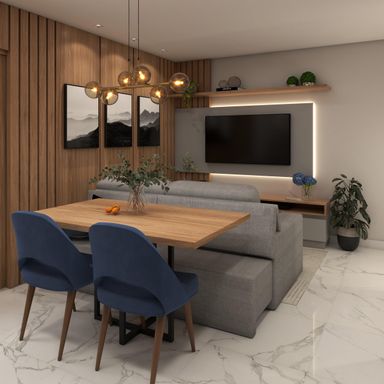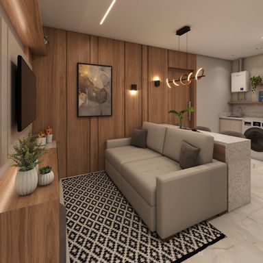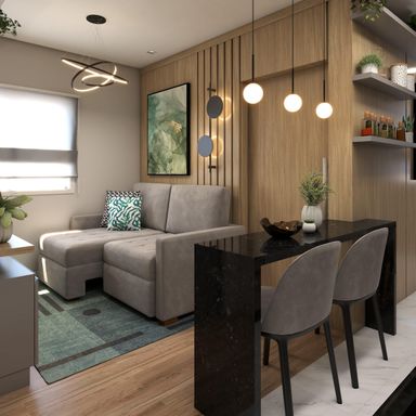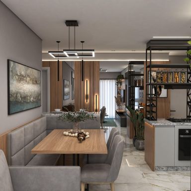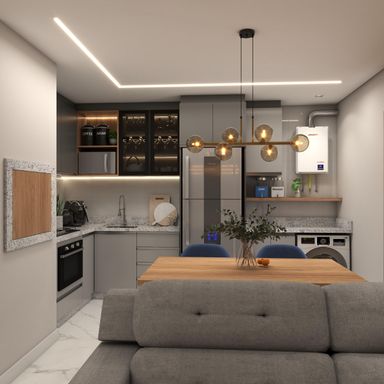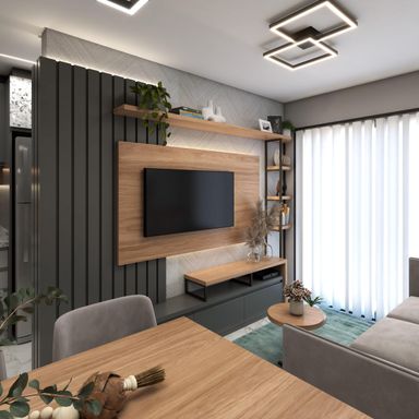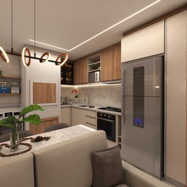 Apartamento de 63m² com 2 quartos, sendo um suíte, banheiro social, sala de estar, jantar e cozinha integradas, espera para lareira, área de serviço, churrasqueira, vaga de garagem e energia solar nas áreas comuns.