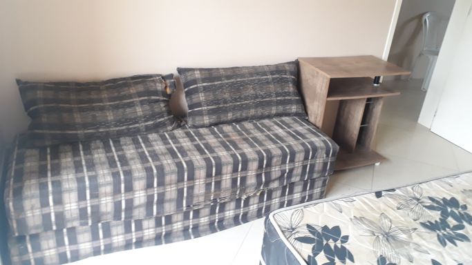 Mobiliado com sofá, cozinha completa com geladeira, fogão 4 bocas e armários, cama de casal box e roupeiro.