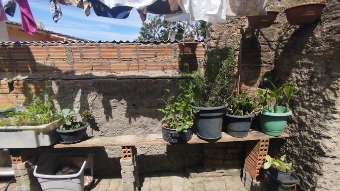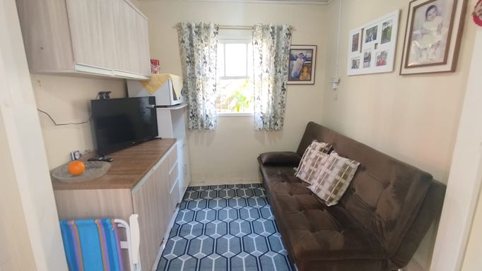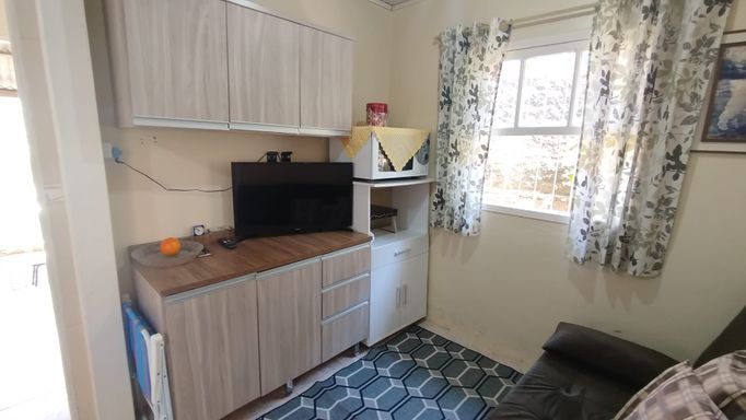Casa 47,40m² com quarto, sala de estar, cozinha, banheiro social, área de serviço e pátio nos fundos.