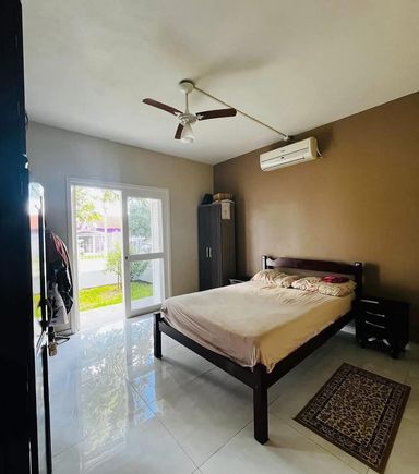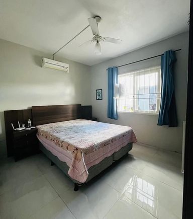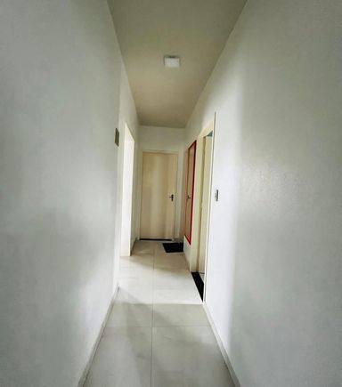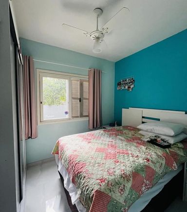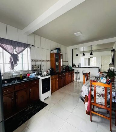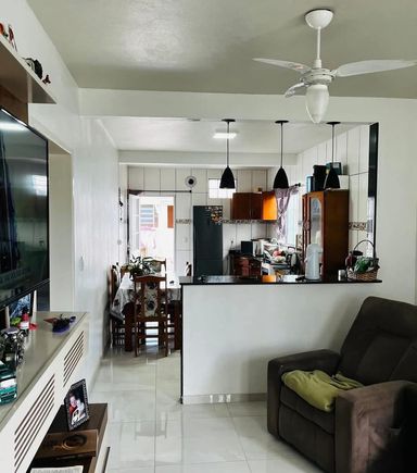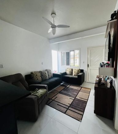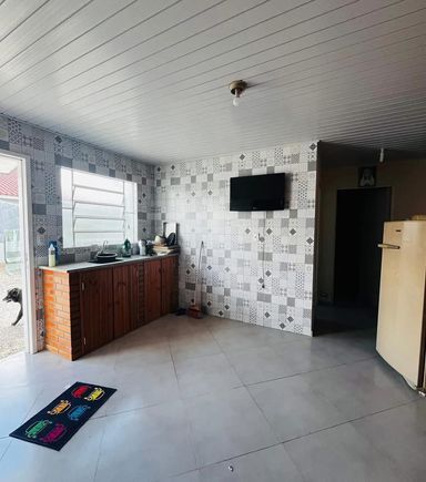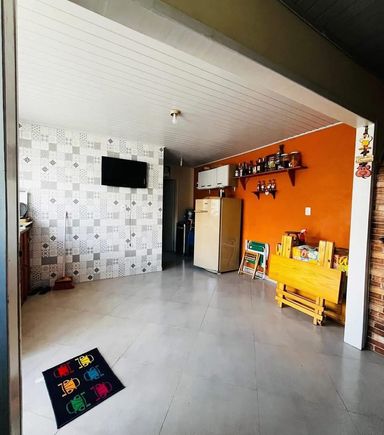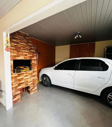 Casa com 2 quartos, banheiro social, sala de estar, cozinha, área de serviço e garagem coberta com churrasqueira.