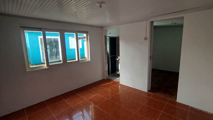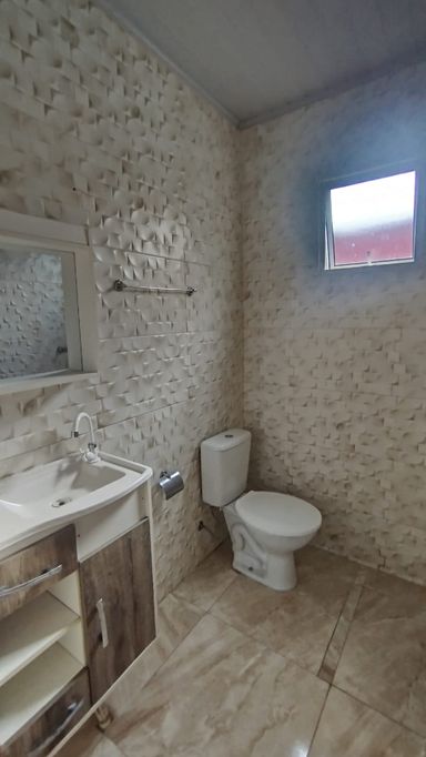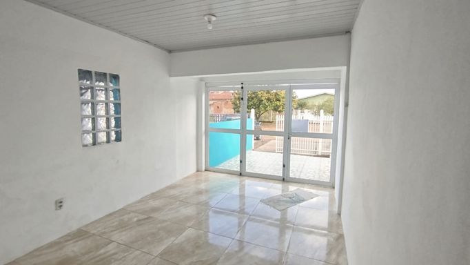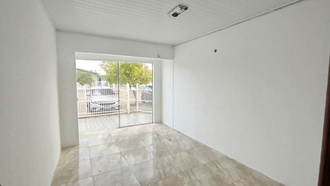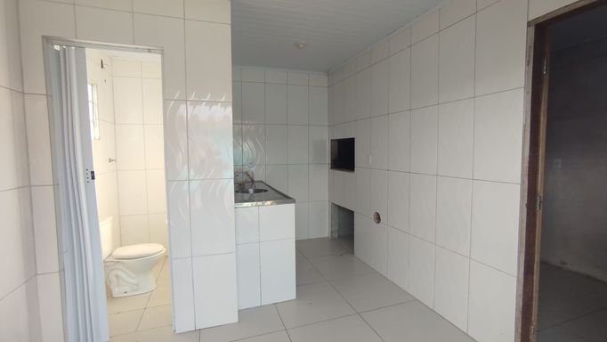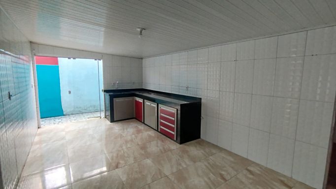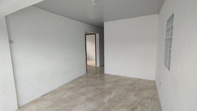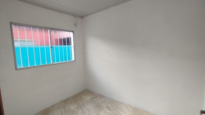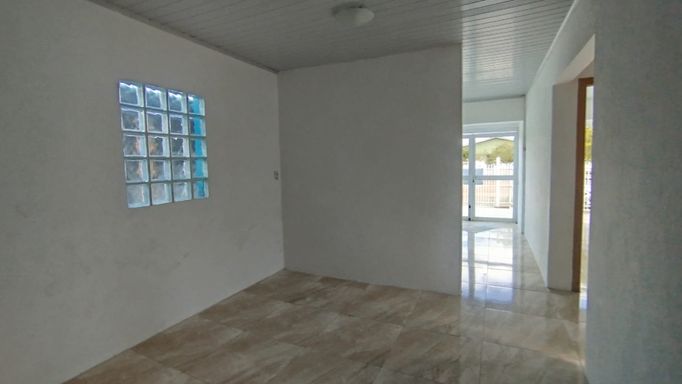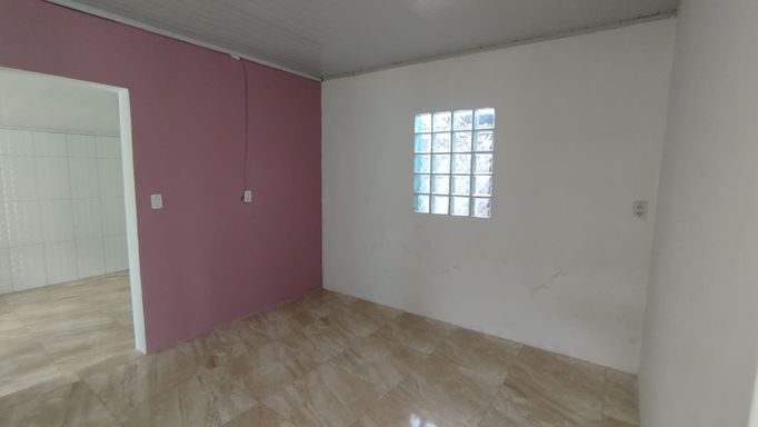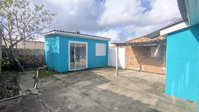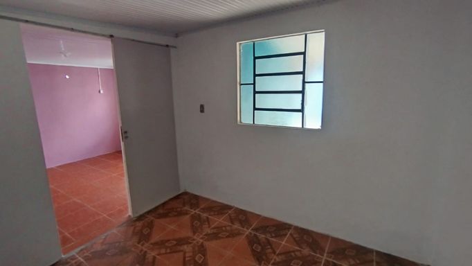 Casa com 2 quartos, banheiro social, sala de estar, cozinha, área de serviço e garagem coberta.
