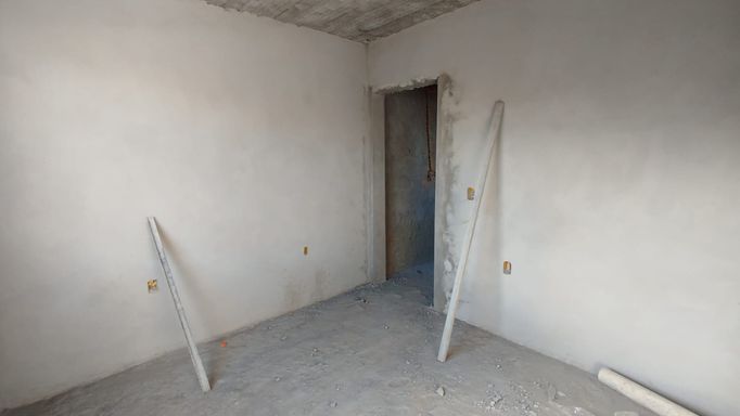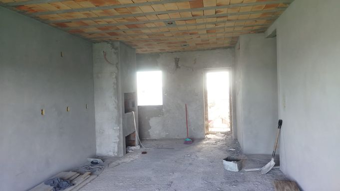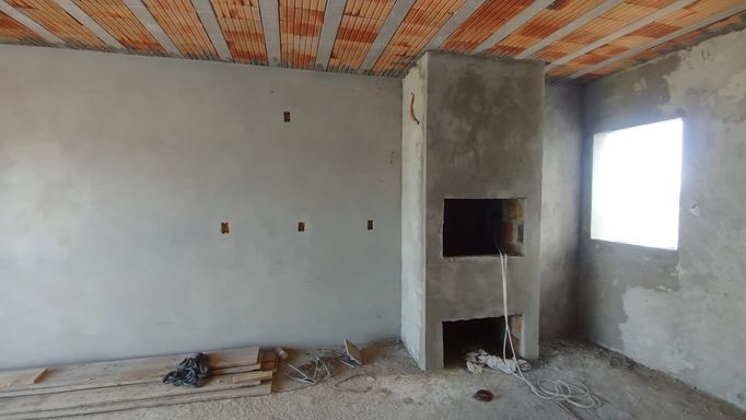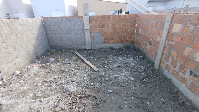 Casa de aproximadamente 50m² com 2 dormitórios, sala e cozinha conjugadas, churrasqueira, banheiro social, varanda/área de serviço e vaga de garagem.