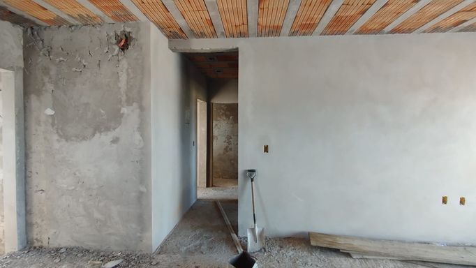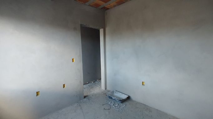 Casa de aproximadamente 50m² com 2 dormitórios, sala e cozinha conjugadas, churrasqueira, banheiro social, varanda/área de serviço e vaga de garagem.