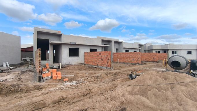 Casa geminada com 62,14m². Possui 2 quartos, sendo um suíte, sala/cozinha conjugadas, churrasqueira, banheiro social, área de serviço, vaga de garagem e pátio.