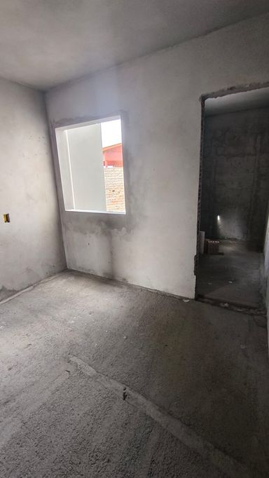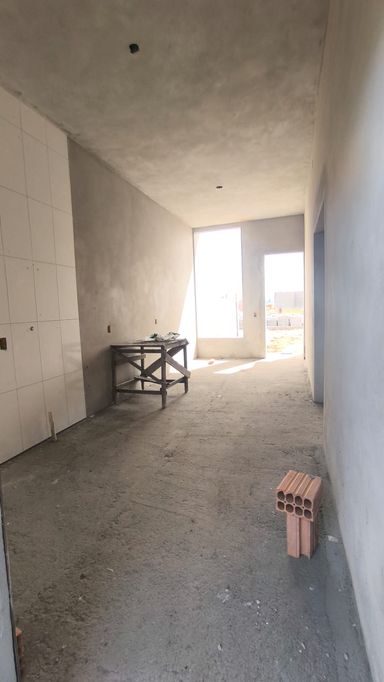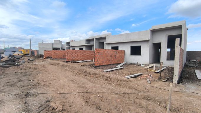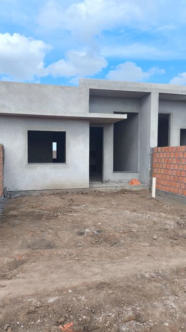 Casa geminada com 62,14m². Possui 2 quartos, sendo um suíte, sala/cozinha conjugadas, churrasqueira, banheiro social, área de serviço, vaga de garagem e pátio.