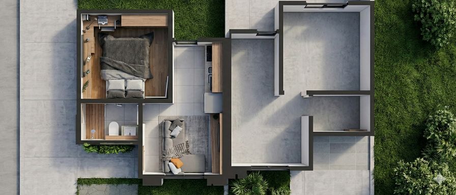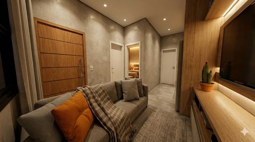 Casa com um quarto, banheiro social, sala e cozinha conjugadas e vaga de garagem descoberta.