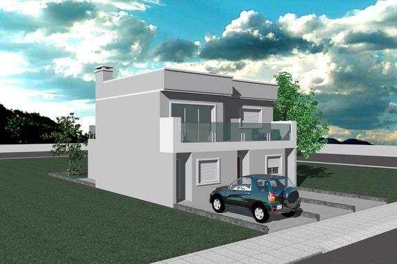 Casa de aproximadamente 50m² com 2 dormitórios, sala e cozinha conjugadas, banheiro social, varanda/área de serviço e vaga de garagem.