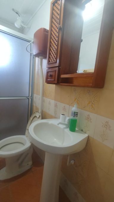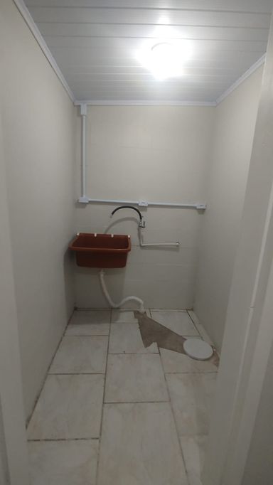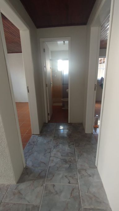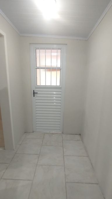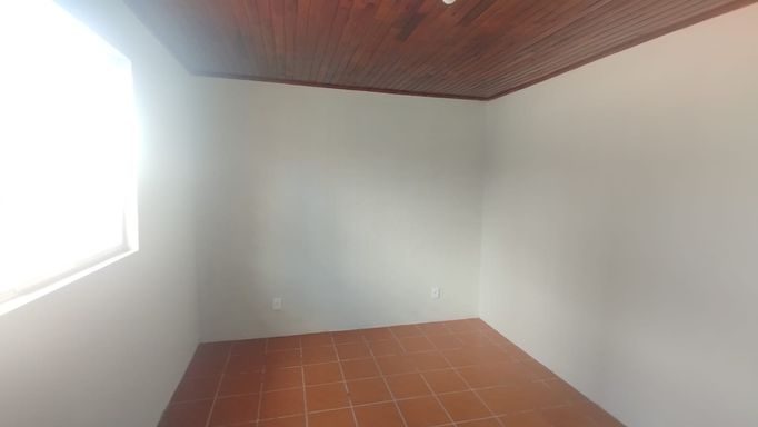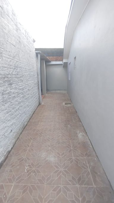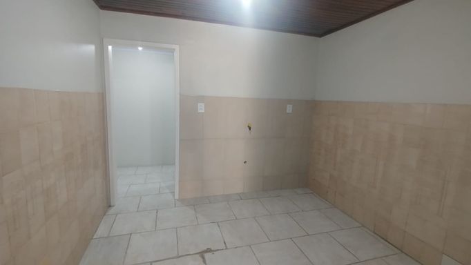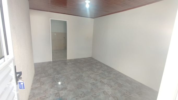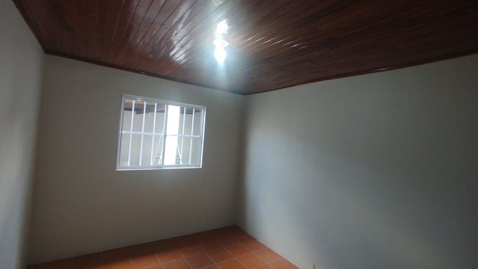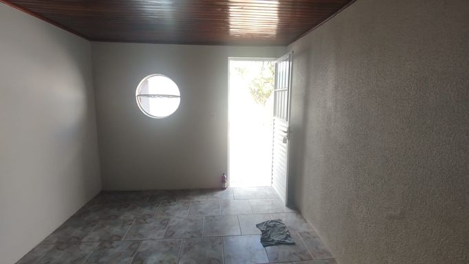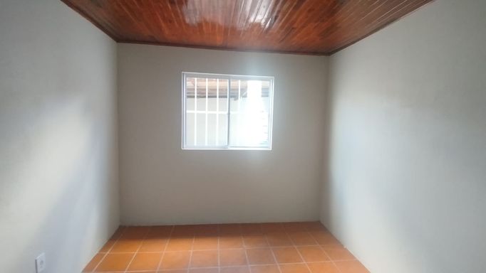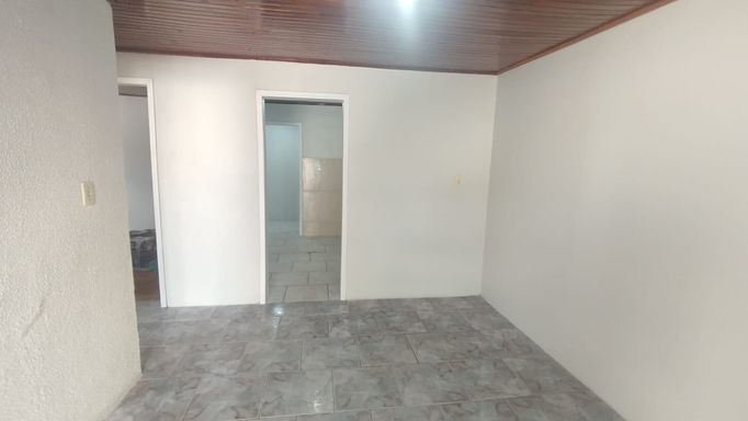 Casa de fundos com 2 quartos, sala de estar, cozinha, banheiro social, área de serviço e vaga de garagem descoberta.